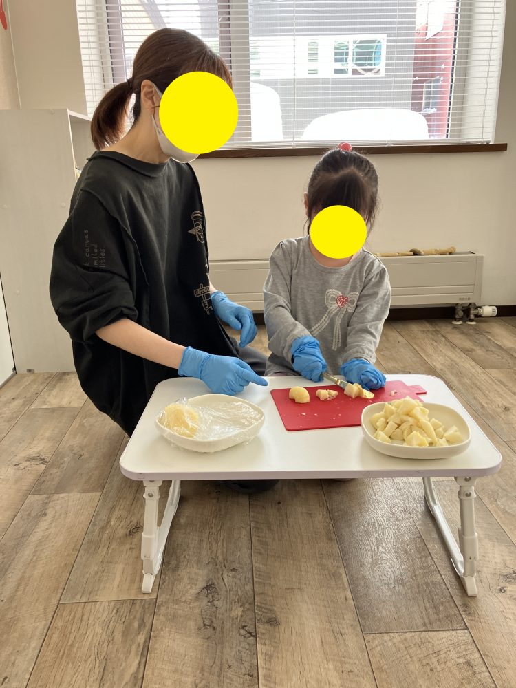 柔らかくしたじゃがいもやウインナーをみんなでたくさん切りました!!